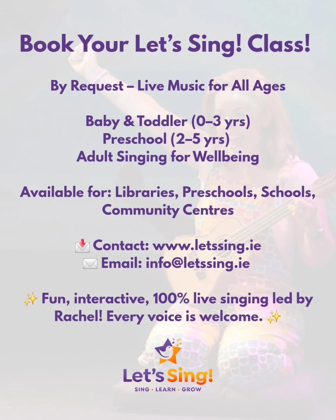 “We’ve been to a few baby classes, but nothing compares to live singing. Rachel’s voice captures every little one’s attention.” — Parent, Dublin